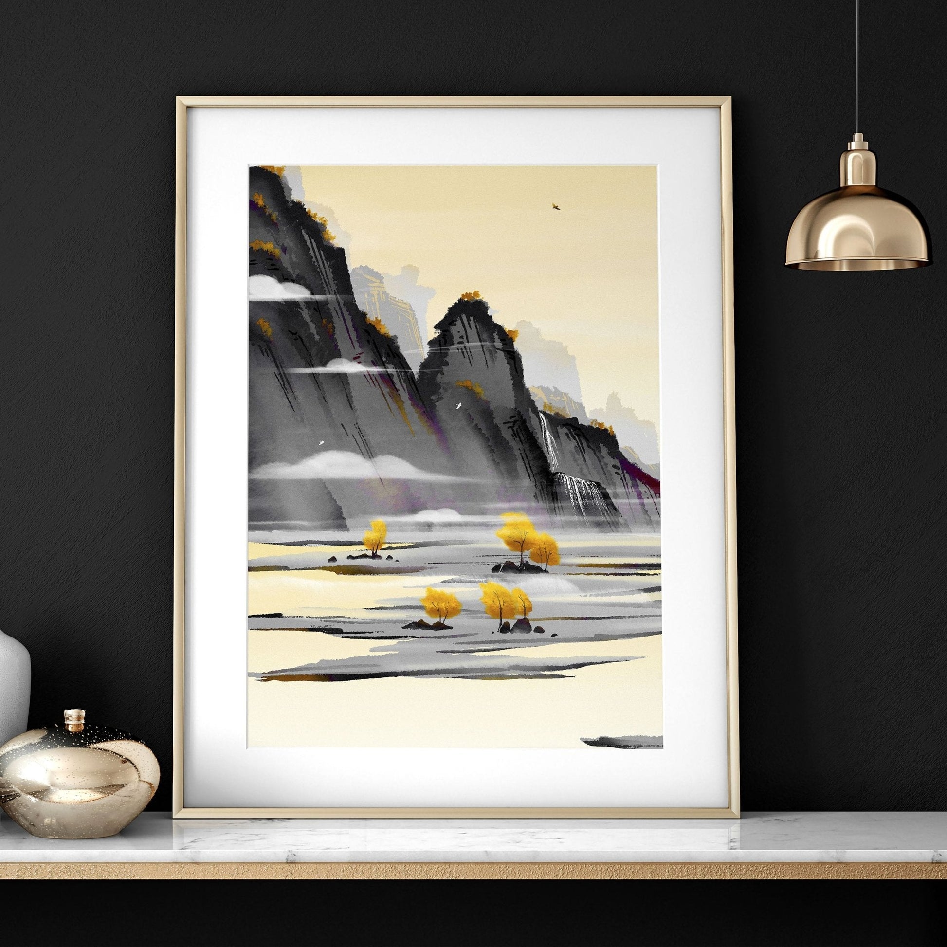 Elevate your office space to a realm of tranquillity with our curated set of three wall art prints, showcasing a serene Japanese landscape adorned in gentle hues of light yellow, balanced with subtle greys and blacks. This collection has been meticulously selected to infuse your workspace with a Zen-like ambience, fostering a sense of calm and focus that enhances your productivity and well-being.